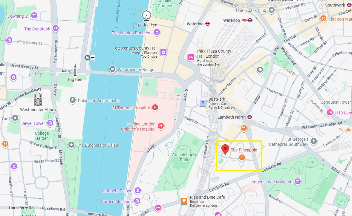 We will be meeting from 18:00 at The Pineapple pub located at 53 Hercules Road, London, SE1 7DZ. The pub is near to Waterloo and Lambeth North train stations and accessible by bus.