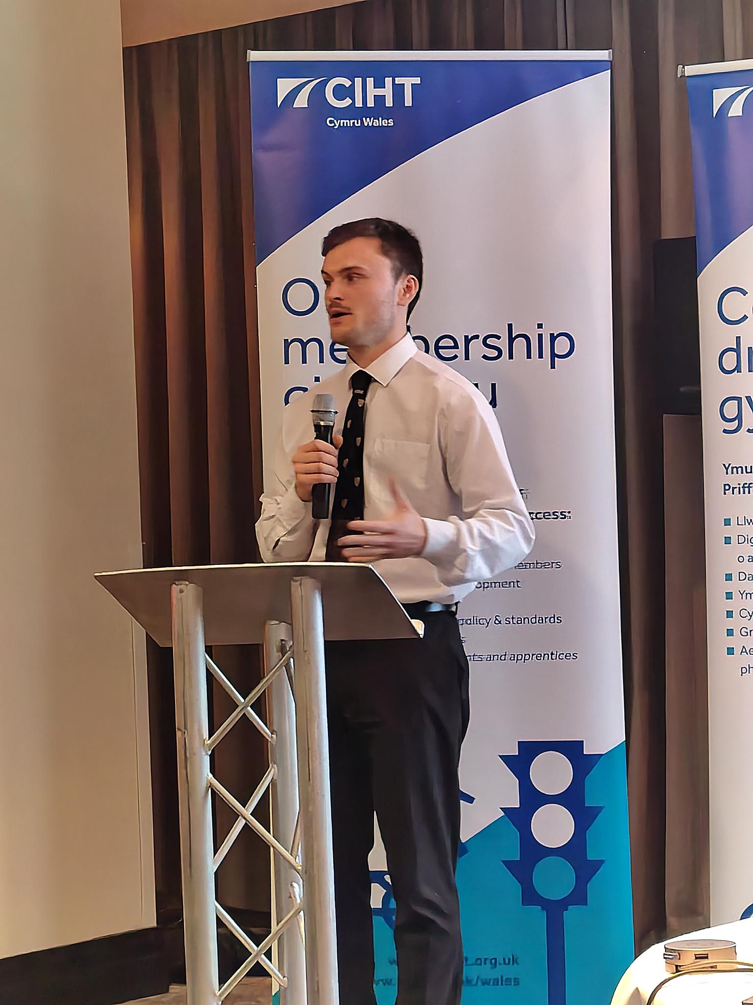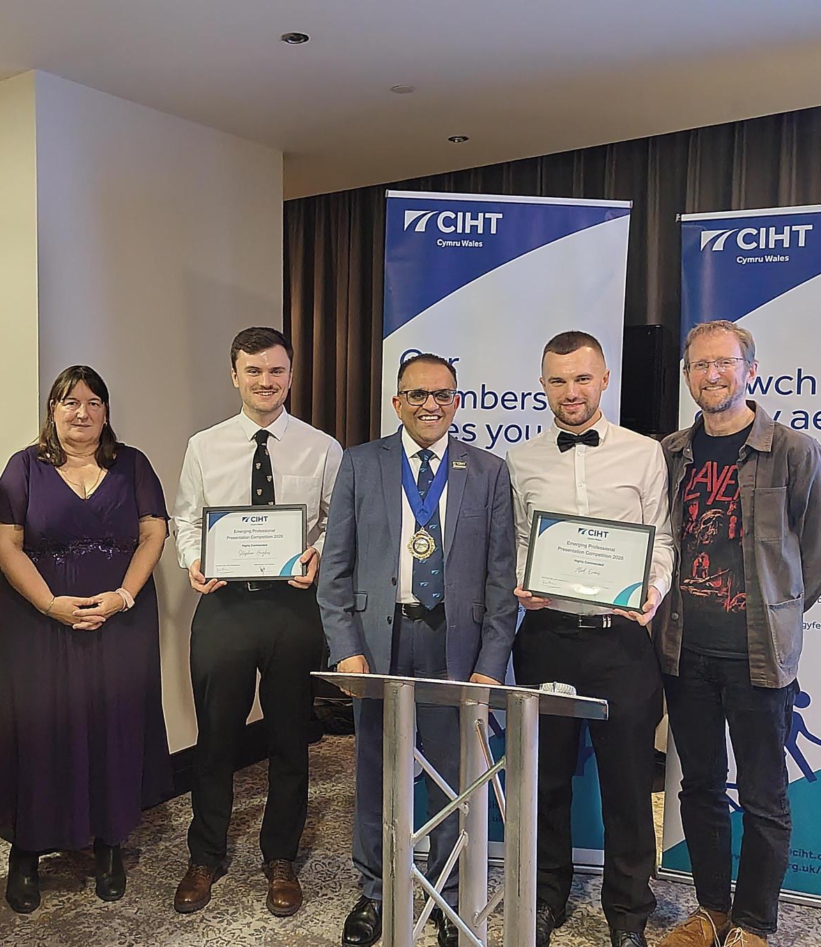 A key highlight of the evening was the final of the CIHT Cymru Wales Emerging Professional Presentation Competition. Three finalists delivered high‑quality presentations ranging from assessing the effectiveness of Wales new CJCs, to bus reform and cycle hangars. It was noted and appreciated by the guests and organisers that the level of respect and attention for the presenters was unprecedented at a dinner event. You could hear a pin drop! And so, the judges had their work cut out in trying to distinguish a winner as all the presentation were absolutely outstanding. As such, they decided to award one winner and 2 highly commended, alongside a People's Choice Award which was voted on by the audience. Here are the results: