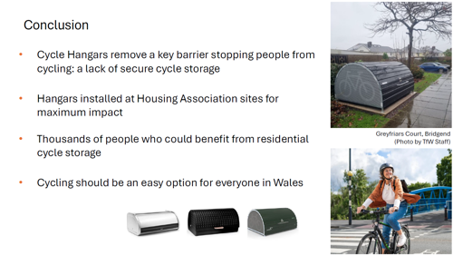 Molly presented on Transport for Wales' Cycle Hangars at Housing Associations project. The judges were particularly impressed with the journey Molly took us on. She clearly outlined of the need for the project drawing on the evidence of over 49,000 bike thefts having been reported in England and Wales in 2025 alone and the potential for secure bike storage to enable cycling for up to 5.5 million people. Then she elaborated on the decision and delivery process of identifying suitable housing associations across Wales where there is demand, as well as considerations for choosing where the cycle hangar would be installed on site. And finishing with the positive impact it is already having on residents, other success stories of residential cycle hangars in the UK and looking ahead at phase 2 of the project.