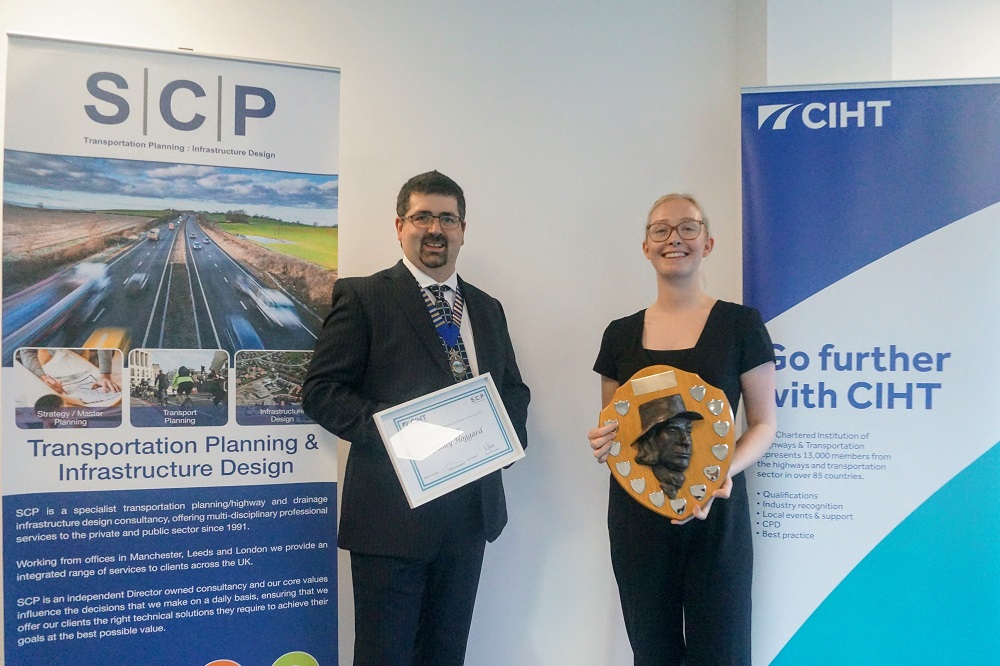The award for Emerging Professional of the Year went to Molly Hoggard. The judges were impressed with the passion for her work to tackle gender inequalities throughout the transportation sector and the leadership she showed in delivering the Gender Equality Toolkit in Transport (GET-IT). Molly is pictured receiving her award, sponsored by SCP, from the CIHT Y&H Chair, Seb Reid.