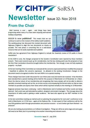 SoRSA Newsletter Issue 32 November 2018 - GG119 is now published! This means that we can continue to work on the revision of the Safety Audit Guidelines. Find out more here