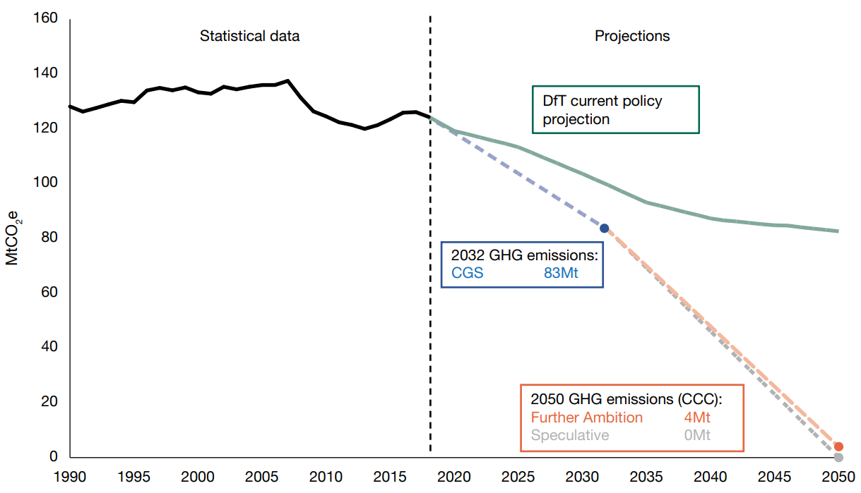 The below figure illustrates the path of transport emissions with current Department for Transport policy and funding and illustrates the scale of the challenge and need for new ambitious policies to achieve net zero. The Clean Growth Strategy (CGS) from 2017 included scenarios for meeting the fifth carbon budget (2028-32) which is shown as the purple line. This is however not current government policy.